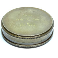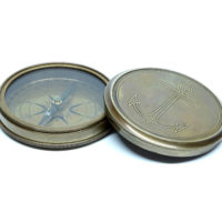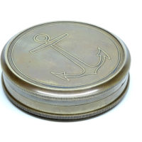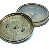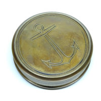 Massiver Messing-Kompass mit integriertem Dauerkalender. Der hinter Glas liegende Kompass wird durch einen massiven, abschraubbaren Messingdeckel geschützt. Im inneren des Deckels befindet ein Dauerkalender, der Ihnen den Wochentag für jedes Datum von 2005 bis 2044 anzeigt. Ein erhabenes Ankersymbol ziert den Deckel von außen. Das Messing wurde brüniert wodurch ein schöner abgegriffener Antik Look eintritt.