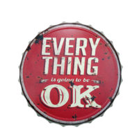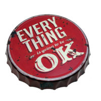 Ein ausgefallenes Wandbild bzw. Werbeschild in Form eines riesigen Kronkorken, welcher plastisch gearbeitet und im Antik-Look bzw. Retro Design gestaltet wurde. Die Aufschrift – EVERY THING is going to be OK – bedarf keiner Erklärung mehr und ist bedingt durch die Größe auch mit entsprechendem Abstand sehr gut zu lesen. Eine entsprechende Vorbereitung auf der Rückseite erleichtert das aufhängen.