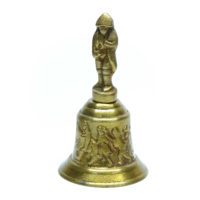 Eine kleine, ausgefallene Handglocke bzw. Tischglocke aus massivem, brünierten Messing mit Napoleon als Handgriff. Die Glocke selbst ist mit Reitern und Soldaten verziert. Die bronzefarbene Oberfläche ist brüniert.