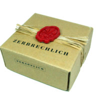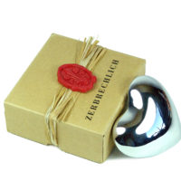 Ein silberfarbenes, klingelndes Herz aus Metall in einer versiegelten Box mit dem Aufdruck „Zerbrechlich“ und „Persönlich“.
