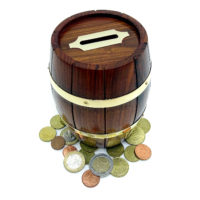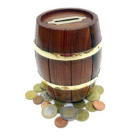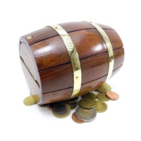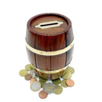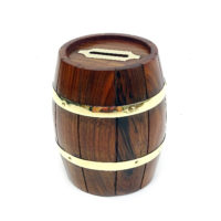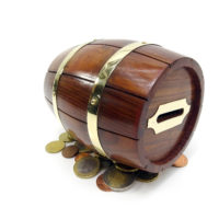 Schöne Handarbeit aus Holz und Messing. Eine Spardose in Fass-Form. Die Fassbänder sowie der eingelassene Einwurfschlitz sind aus massiven Messing gefertigt. Die Entnahme erfolgt über den Boden, der sich zur Hälfte nach lösen einer Schraube aufklappen lässt.