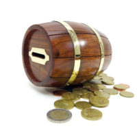 Aus Wunsch und gegen Aufpreis lässt sich dieses Spardosen Fass auch mit gravierten Messing-Schildern in unterschiedlichen Größen und Formen personalisieren.