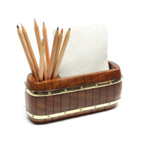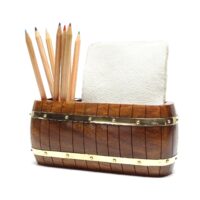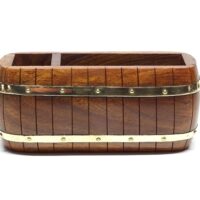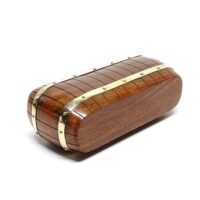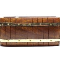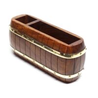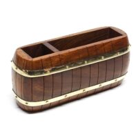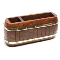Sehr dekorative Stift Box im maritimen Fass-Design. Die Box wurde aus dunklem Holz mit ausgesprochen schöner Maserung von Hand gefertigt. An den Seiten sind polierte Messingbeschläge in Form von Fassbändern aufgebracht. Insgesamt bietet die Box zwei Fächer für Stifte und Zettel. Eine tolle Handarbeit aus wertigen Materialien.