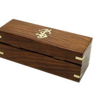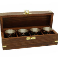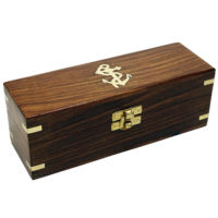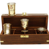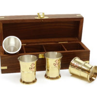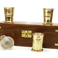 Ein kleiner Becher Rum in geselliger Runde gehört zum Segeln wie das Wasser unterm Kiel. Damit das ganze kultiviert vonstattengehen kann, finden Sie für sich und drei weitere Gäste vier kleine, von innen versilberte, Messingbecher mit je einem Anker verziert, in einer sehr dekorativen Box aus Teakholz. Die mit Samt ausgeschlagene Box dient zugleich der sicheren Aufbewahrung und ist außen mit Messingapplikationen und Einlegearbeiten verziert. Auf dem Deckel der Box ist ein Messinganker eingelassen.