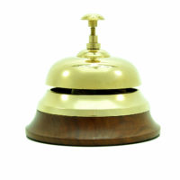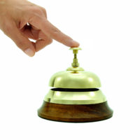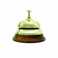 Eine echte Rezeptionsklingel, oder auch Hotelglocke genannt, wie man sie aus Hotels und von Empfangstresen kennt. Die Glocke wurde aus Messing gegossen und erzeugt einen hellen und lauten Klang je nach dem wie auf den Knopf gedrückt wird. Ein dunkelfarbener, gedrechselter Holzsockel bietet eine perfekte Basis und passt farblich perfekt zum gold-glänzenden Messing der Tresenglocke.