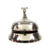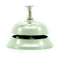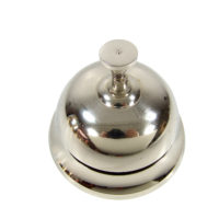 Eine echte Rezeptionsklingel, oder auch Hotelglocke genannt, wie man sie aus Hotels und von Empfangstresen (Tresenglocke) kennt. Die Glocke wurde aus Messing gegossen und vernickelt. Sie erzeugt einen hellen und lauten Klang je nach dem wie auf den Knopf gedrückt wird. Analog zu dieser Ausführung, finden sich im Shop auch Exemplare mit einem Holzsockel.