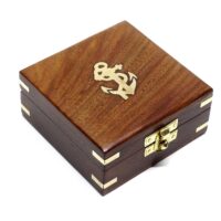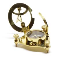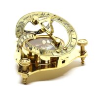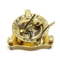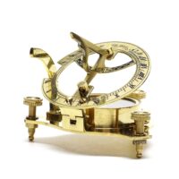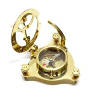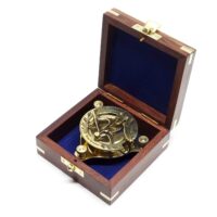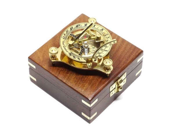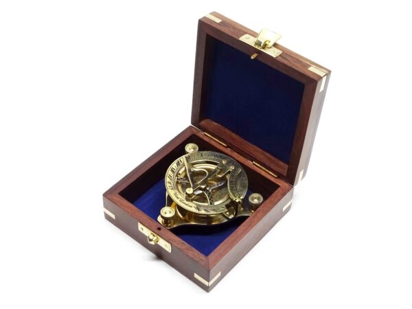 Ein wunderschöner, handgefertigter Nachbau eines antiken Kompass aus Messing mit einer integrierten Sonnenuhr. Zur ebenen Ausrichtung des Modells sind drei Stellschrauben vorhanden. Die runde Ziffernscala der Sonnenuhr lässt sich ebenso wie der Polstab (Zeiger) und ein Neigungsmesser mit Gradeinteilung aufstellen. Darunter verbirgt sich der Kompass, dessen Kompassnadel mittels verschiebbaren Feststellers fixieren lässt. Die Holz-Box mit ihrem dunklen Holz und den goldglänzenden Messingbeschlägen dient der sicheren Aufbewahrung und wirkt sehr dekorativ.