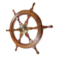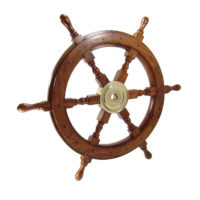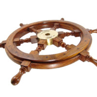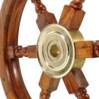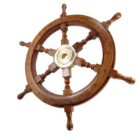 Ein mittelgroßes, preiswertes und dekoratives Steuerrad mit eingearbeiteter Nabe aus poliertem Messing. Das Schiffs-Steuerrad ist aus Holz in traditioneller Weise gefertigt. Dieses ausgefallene Stück passt sehr gut in jede Hafenkneipe oder Partykeller. Eine perfekte maritime Dekoration z.B. auch als Schaufensterdekoration für Gewerbetreibende. Aber auch als personalisiertes Präsent für Beförderungen, Danksagungen u.s.w. wird es gerne und oft insbesondere von Werbe- und Marketingagenturen verwendet.