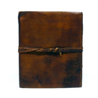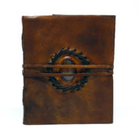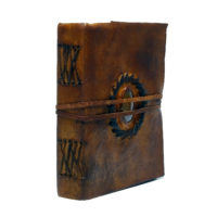 Bei diesem Buch wurde ein kleiner Karneol Schmuckstein (Halbedelstein) in Cabochon Form auf den Einband platziert. Die Einfassung des Steins erfolgte mittels einem runden, umflochtenen Lederpatch auf dem vorderen Buchdeckel. Der gesamte Bucheinband ist in einem hell-braunen und zugleich wolkigem Farbton gehalten. Das Buch wird durch umwickeln mit einem Lederband verschlossen.