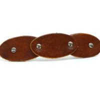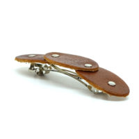 Ausgefallene, französische Haarspange mit aufgenieteten Lederpatches. Es handelt sich hierbei um ein vegetabil gegerbtes, im Farbton Lion (hellbraun) gefärbtes süddeutsches Rindsleder, welches von Hand gestanzt, gelocht, gefärbt und vernietet wird. Die französische Metallspange mit loser Feder besteht aus rhodiniertem Metall und ist einfach in der Handhabung. Weitere Farben und Ausführungen finden Sie im Shop. Farben und Ledernarbung können geringfügig abweichen, da jedes Stück einzeln angefertigt wird.