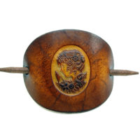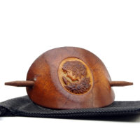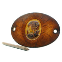 Ausgefallene Haarspange bzw. Haarklammer, in der Farbe Antique aus handgefärbten, derben Rindsleder mit einem Holzstab. Die eindrucksvolle Prägung in Form einer Gemme bzw. Kamee (Cameo) zeigt den Kopf einer Frau, wir nennen sie Charlotte, welche von der Biedermeierzeit (1815-1848) bis in die 1920 Jahre gelebt haben könnte. Diese Cameo Serie beinhaltet weitere 14 unterschiedliche Darstellungen von Frauen aus der Zeit des Biedermeiers bis zu den goldenen Zwanzigern.