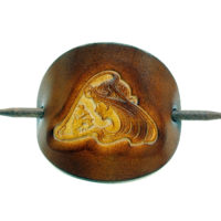 Ausgefallene Haarspange bzw. Haarklammer, in der Farbe Antique aus handgefärbten, derben Rindsleder mit einem Holzstab. Die eindrucksvolle Prägung in Form einer Gemme bzw. Kamee (Cameo) zeigt den Kopf einer Frau, wir nennen sie Magdalena, welche von der Biedermeierzeit (1815-1848) bis in die 1920 Jahre gelebt haben könnte. Diese Cameo Serie beinhaltet weitere 14 unterschiedliche Darstellungen von Frauen aus der Zeit des Biedermeiers bis zu den goldenen Zwanzigern.
