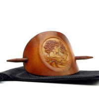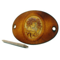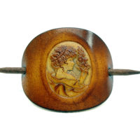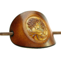 Ausgefallene Haarspange bzw. Haarklammer, in der Farbe Antique aus handgefärbten, derben Rindsleder mit einem Holzstab. Die eindrucksvolle Prägung in Form einer Gemme bzw. Kamee (Cameo) zeigt den Kopf einer Frau, wir nennen sie Margarethe, welche von der Biedermeierzeit (1815-1848) bis in die 1920 Jahre gelebt haben könnte. Diese Cameo Serie beinhaltet weitere 14 unterschiedliche Darstellungen von Frauen aus der Zeit des Biedermeiers bis zu den goldenen Zwanzigern.