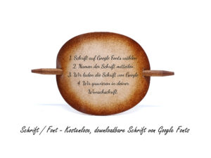 Es stehen fünf Schriften zur Verfügung. Optional kann gegen Aufpreis auch als Schriftart Google Fonts gewählt werden. Das bedeutet, das Sie sich eine der kostenlosen und frei herunterladbaren Schriftarten aus dem Google Fonts Sortiment aussuchen und uns im Anschluss den Namen der Schriftart mitteilen. Wir laden die Schriftart im Anschluss von Google herunter und gravieren Ihren Text in Ihrer Wunschschriftart.