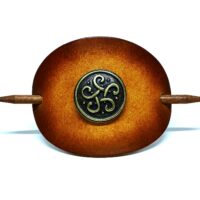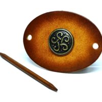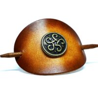 Ausgefallene Haarspange bzw. Haarklammer, in der Farbe Antique Lion aus handgefärbten, derben Rindsleder und einem Holzstab. Diese einzigartige Haarspange ist mit einer Zierniete, die einen keltischen Knoten darstellt, bestückt. Die Zierniete aus Metall ist im Farbton Gold-Antik gehalten.