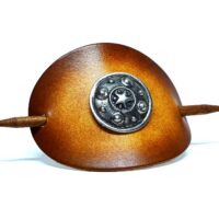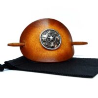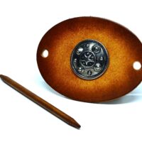 Ausgefallene Haarspange bzw. Haarklammer, in der Farbe Antique Lion aus handgefärbten, derben Rindsleder und einem Holzstab. Diese einzigartige Haarspange ist mit einer Zierniete, die ein altes Rundschild der römischen Legionäre darstellt, bestückt. Die Zierniete aus Metall ist im Farbton Silber-Antik gehalten.
