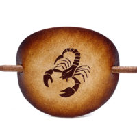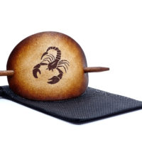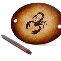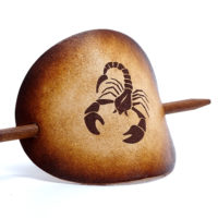Ausgefallene Haarspange oder Haarklammer, aus vegetabil-gegerbten Rindsleder mit einem Sternzeichen bzw. einer Tierkreiszeichen-Gravur. Das Leder sowie der Holzstab wurde von Hand gefärbt und poliert. Ein kleiner Kordelzugbeutel dient der Aufbewahrung und schützt das Leder.