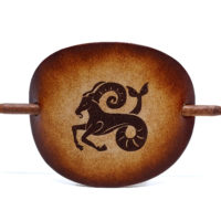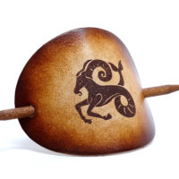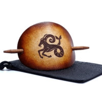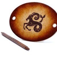 Ausgefallene Haarspange oder Haarklammer, aus vegetabil-gegerbten Rindsleder mit einem Sternzeichen bzw. einer Tierkreiszeichen-Gravur. Das Leder sowie der Holzstab wurde von Hand gefärbt und poliert. Ein kleiner Kordelzugbeutel dient der Aufbewahrung und schützt das Leder.