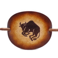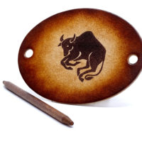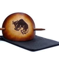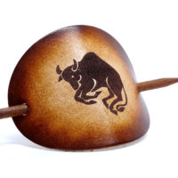 Ausgefallene Haarspange oder Haarklammer, aus vegetabil-gegerbten Rindsleder mit einem Sternzeichen bzw. einer Tierkreiszeichen-Gravur. Das Leder sowie der Holzstab wurde von Hand gefärbt und poliert. Ein kleiner Kordelzugbeutel dient der Aufbewahrung und schützt das Leder.