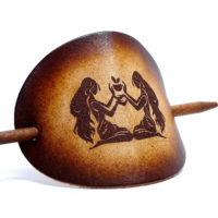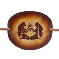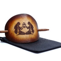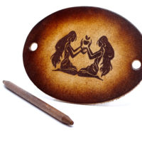 Ausgefallene Haarspange oder Haarklammer, aus vegetabil-gegerbten Rindsleder mit einem Sternzeichen bzw. einer Tierkreiszeichen-Gravur. Das Leder sowie der Holzstab wurde von Hand gefärbt und poliert. Ein kleiner Kordelzugbeutel dient der Aufbewahrung und schützt das Leder.