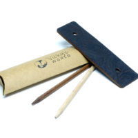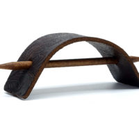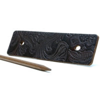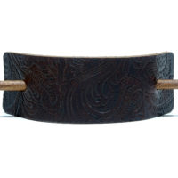 Schlichte, dunkelbraune Leder Haarspange mit eingeprägtem Muster im Paisley Look. Die Prägung auf der Haarspange zeigt einen kleinen Ausschnitt aus einem wiederkehrenden Muster das ca. 50×50 cm groß ist. Da die Wahl des jeweiligen Ausschnitts rein zufällig erfolgt, zeigt jeder dieser Haarspangen einen anderen, kleinen Bereich des Musters. Somit sind die Produktabbildungen bitte als exemplarisch zu betrachten, da jedes Stück ein Unikat darstellt. Es handelt sich hierbei um ein recht ständiges Rindsleder mit einer Dicke von bis zu 3mm. Ein im Antik-Look gebeizter Holzstab (Buche) aus FSC-zertifiziertem Anbau sorgt für einen perfekten Halt. Zusätzlich liegt ein naturfarbener Holzstab bei, der als kontrastgebendes Element für Abwechslung sorgt. Alles verpackt in einer reizvollen Kissenbox aus recyceltem Craft-Karton.