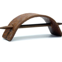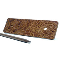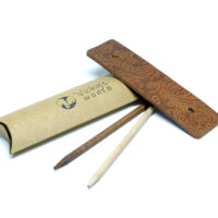 Schlichte, braune Leder Haarspange mit eingeprägtem Muster im Paisley Look. Die Prägung auf der Haarspange zeigt einen kleinen Ausschnitt aus einem wiederkehrenden Muster das ca. 50×50 cm groß ist. Da die Wahl des jeweiligen Ausschnitts rein zufällig erfolgt, zeigt jeder dieser Haarspangen einen anderen, kleinen Bereich des Musters. Somit sind die Produktabbildungen bitte als exemplarisch zu betrachten, da jedes Stück ein Unikat darstellt. Es handelt sich hierbei um ein recht ständiges Rindsleder mit einer Dicke von bis zu 3mm. Ein im Antik-Look gebeizter Holzstab (Buche) aus FSC-zertifiziertem Anbau sorgt für einen perfekten Halt. Zusätzlich liegt ein naturfarbener Holzstab bei, der als kontrastgebendes Element für Abwechslung sorgt. Alles verpackt in einer reizvollen Kissenbox aus recyceltem Craft-Karton.